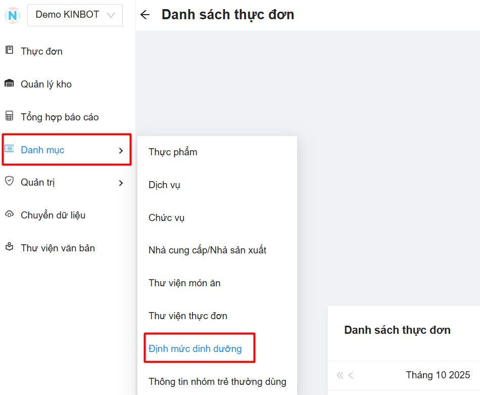 Bước 1: Vào danh mục -> định mức dinh dưỡng