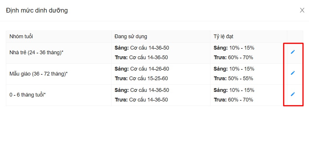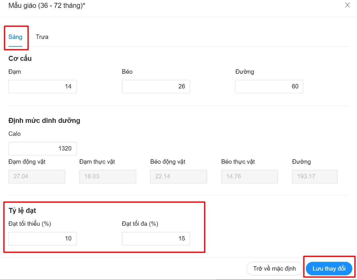 Mức tỷ lệ đạt cần thiết trong khẩu phần ăn sáng hàng ngày được khuyến nghị từ 10% - 15% so với định mức 1 ngày mà cơ cấu dinh dưỡng yêu cầu. Mặc định phần mềm đã cài đặt theo tỷ lệ 10%-15%, tuy nhiên nếu trường có nhu cầu điều chỉnh lại có thể làm theo hướng dẫn sau: