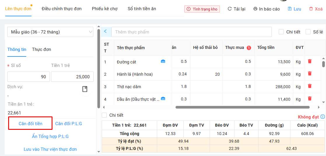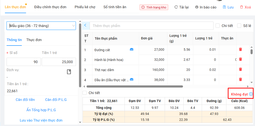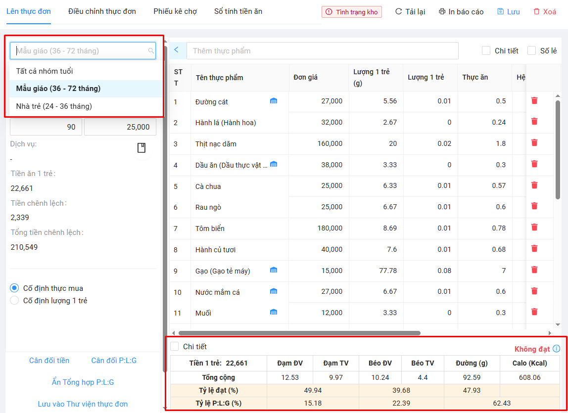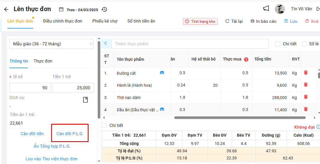 - Chọn nhóm trẻ muốn cân đối dinh dưỡng. Phần mềm hiển thị bảng tổng hợp P:L:G và đánh giá thực đơn có đạt hay không