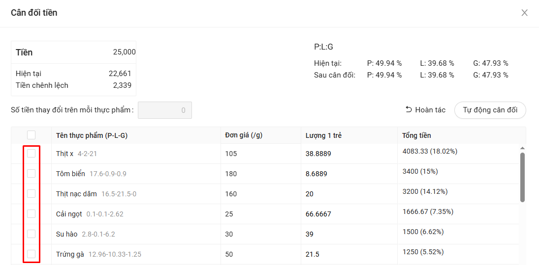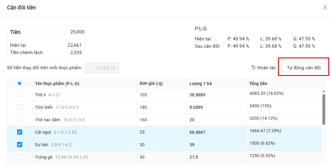Bước 3: Bấm vào nút Tự động cân đối. Phần mềm sẽ điều chỉnh lại lượng mua của các thực phẩm đã chọn để tiền chênh lệch về 0