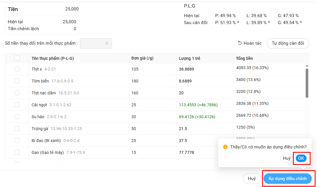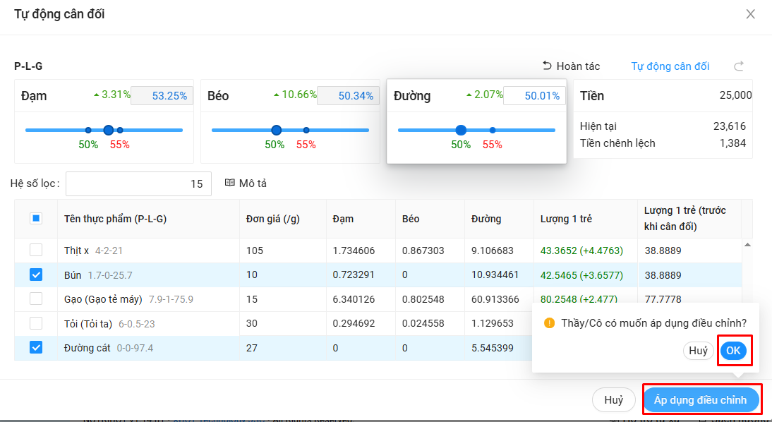 Bước 3: Bấm nút Áp dụng điều chỉnhOK để hoàn tất việc cân đối dinh dưỡng