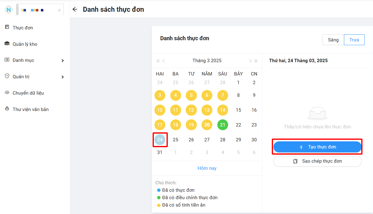 Bước 1: Tại Danh sách thực đơn chọn ngày cần lên thực đơn và bấm nút Tạo thực đơn