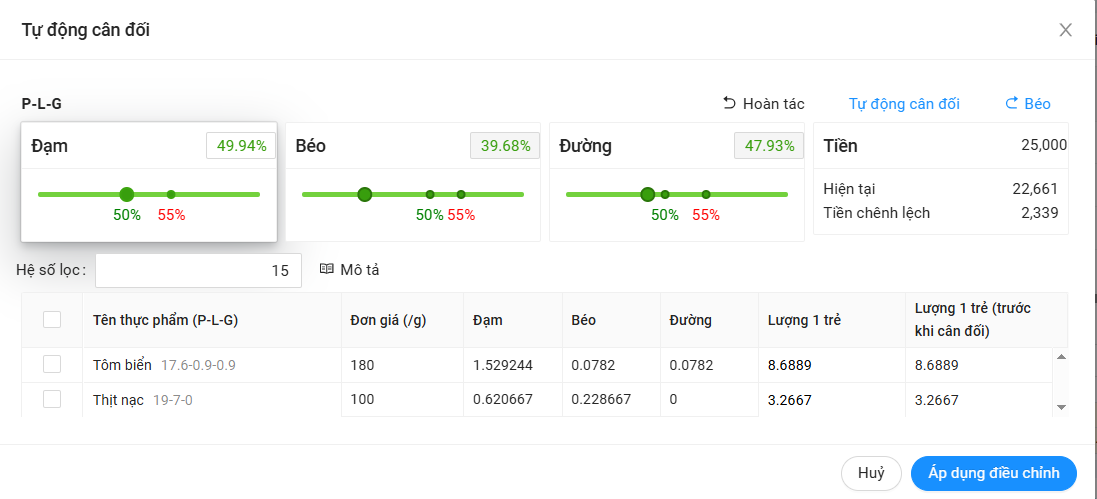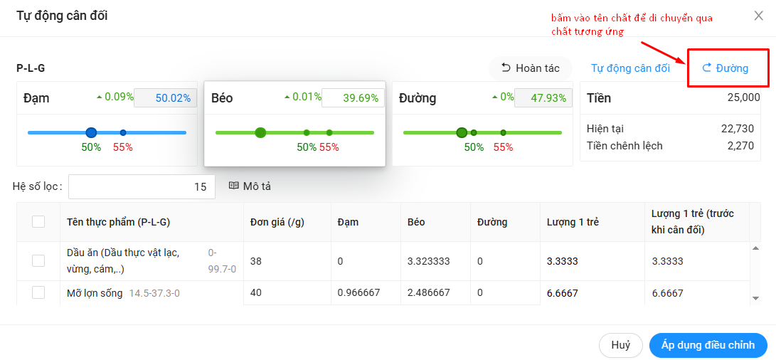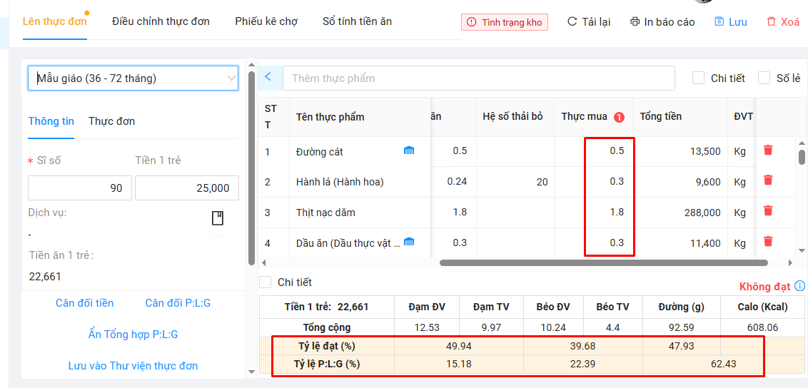 Cách 1: Điều chỉnh thủ công lượng thực mua của thực phẩm để tỷ lệ các chất Đạm, Béo, Đường và Calo nằm trong khoảng quy định