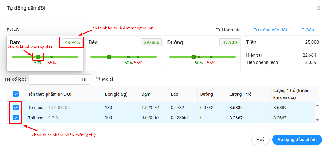 Bước 2: Chọn thực phẩm phần mềm gợi ý và kéo chấm tròn to về khoảng đạt hoặc nhập tỷ lệ đạt thầy/cô mong muốn.