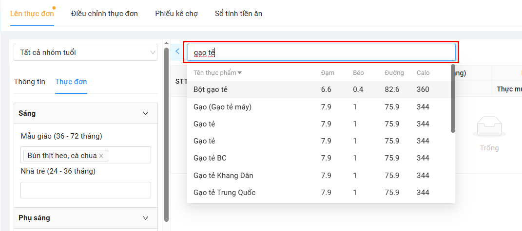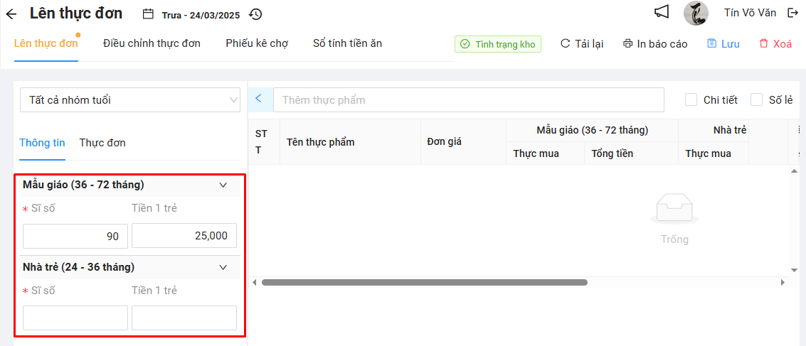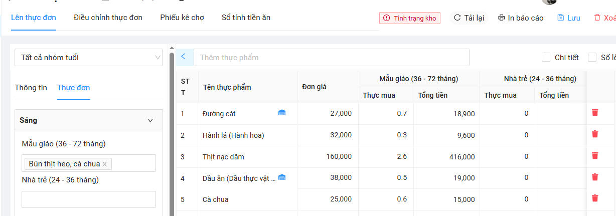 Mục đích: Thầy/Cô lên thực đơn dự trù cho 1 ngày theo nhóm tuổi, cân đối thực đơn đạt về dinh dưỡng và cân đối tiền thu, chi trong thực đơn.