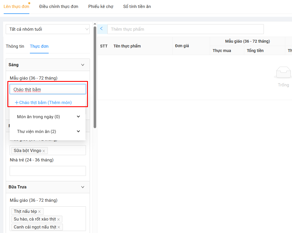 Bước 3: Bấm qua tab Thực đơn nhập tên món ăn và bấm Thêm món vào các bữa ăn tương ứng
