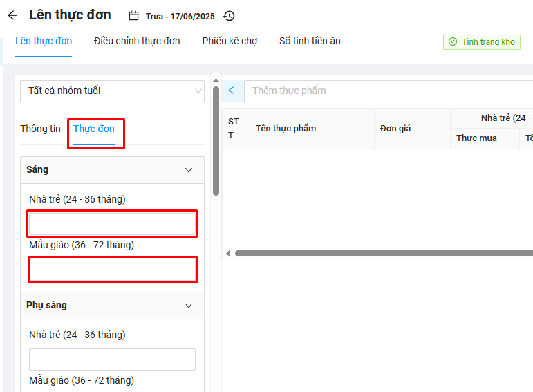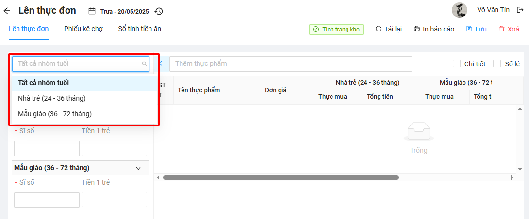 Mặc định khi tạo thực đơn phần mềm sẽ hiển thị tất cả nhóm tuổi theo cấu hình nhóm tuổi đã thiết lập. Thầy/Cô có thể chọn Tất cả nhóm tuổi để nhập thông tin thực đơn cho tất cả nhóm trẻ đang có hoặc chọn vào nhóm tuổi cụ thể để lên thực đơn và cân đối thực đơn riêng cho từng nhóm