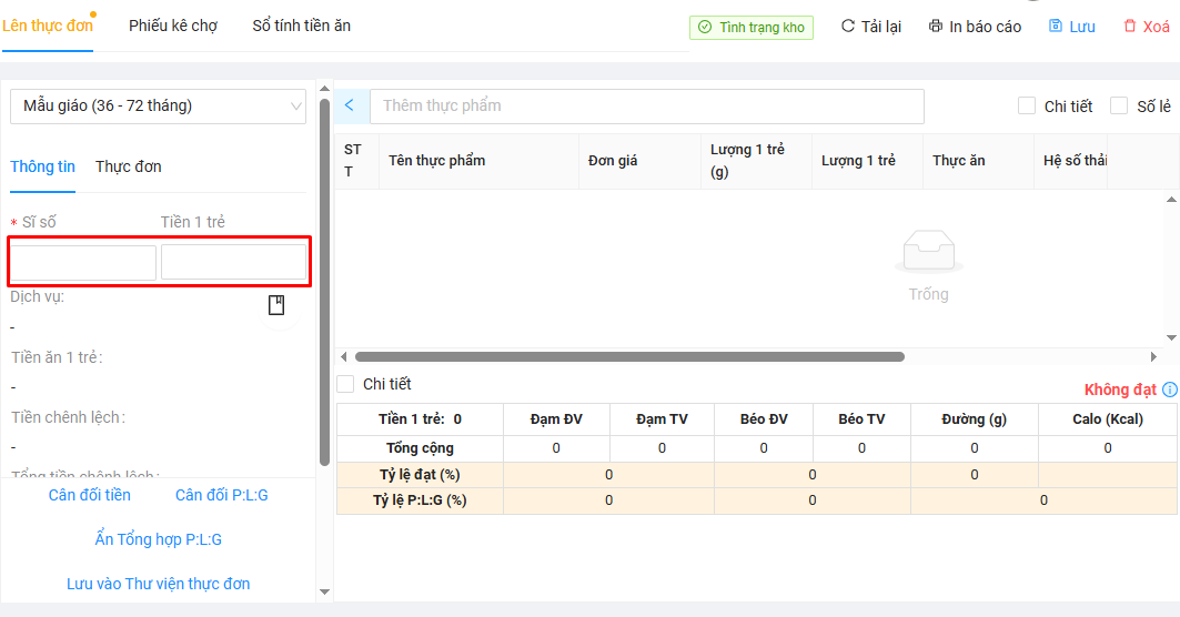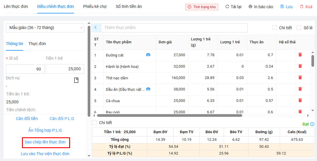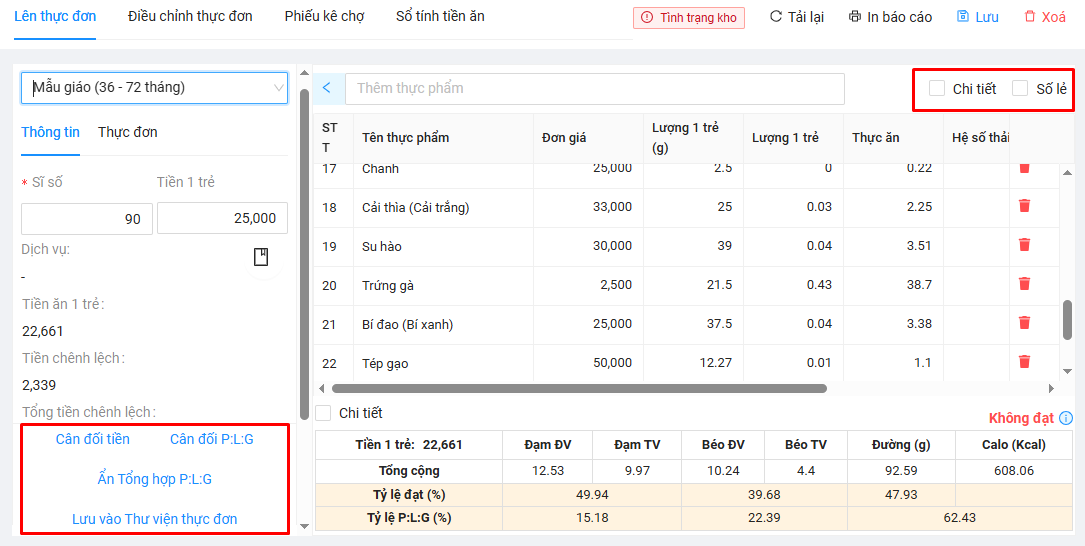 - Tính năng Cân đối P:L:G giúp thầy/cô dễ dàng cân đối đạt dinh dưỡng trong thực đơn