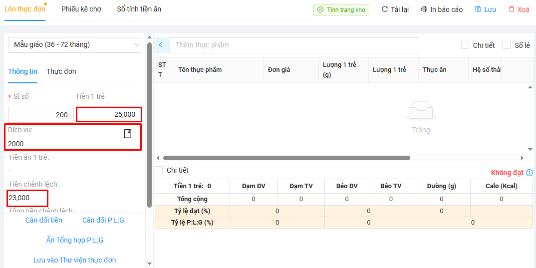- Tính năng Cân đối tiền giúp thầy/cô dễ dàng dự trù được thực đơn sát với tiền ăn hằng ngày