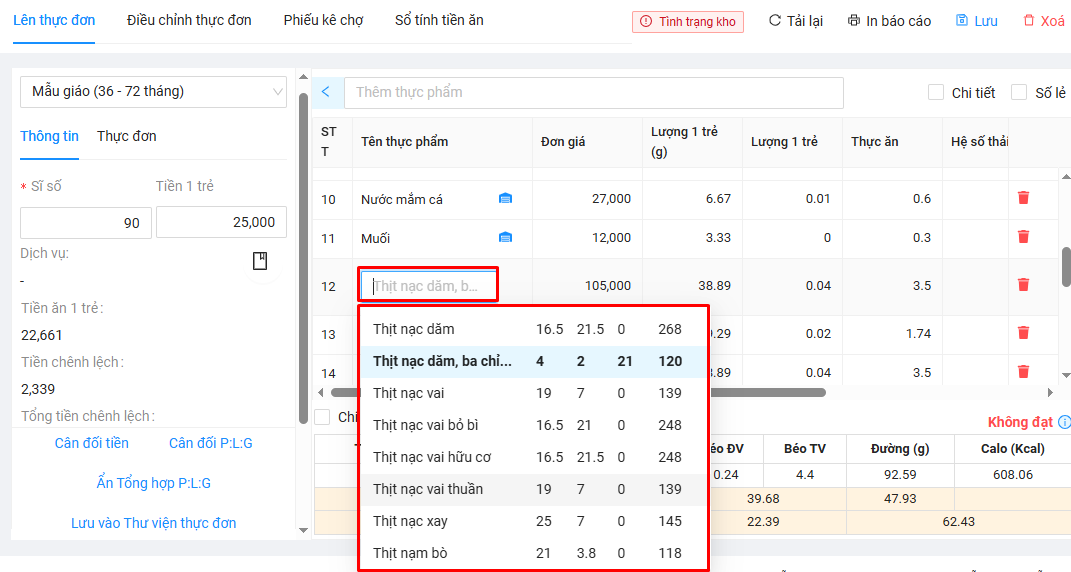 Khi cần thay đổi thực phẩm trong thực đơn, thầy/cô chỉ cần bấm trực tiếp vào tên thực phẩm. Phần mềm sẽ gợi ý các loại thực phẩm tương ứng, đồng thời hiển thị lượng đạm – béo – đường – calo trong mỗi 100g. Nhờ đó, thầy/cô dễ dàng so sánh thành phần dinh dưỡng và lựa chọn loại thực phẩm phù hợp hơn với khẩu phần