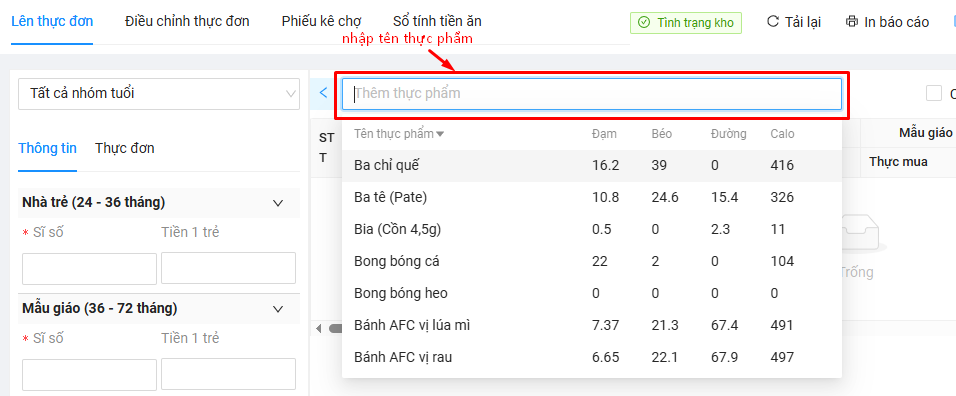 Để thêm thực phẩm vào thực đơn, thầy/cô chỉ cần nhập tên thực phẩm, phần mềm sẽ gợi ý danh sách thực phẩm liên quan và hiển thị thông tin về đạm - béo - đường - calo của từng loại, giúp thầy/cô dễ dàng chọn lựa thực phẩm phù hợp. Thầy/cô sẽ nhập trực tiếp đơn giá và số lượng của từng thực phẩm ngay trong giao diện thực đơn.