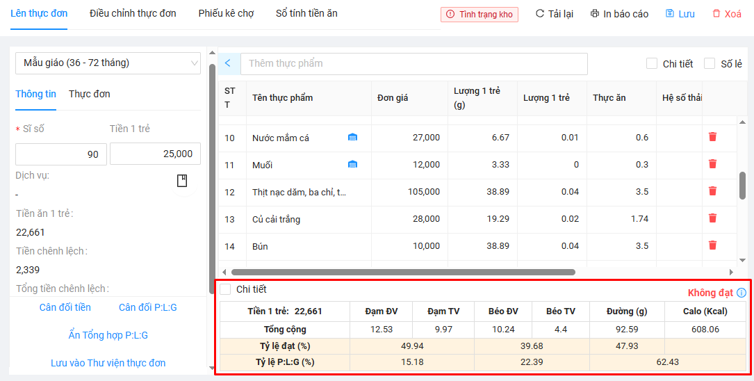 Bảng tổng hợp dinh dưỡng giúp thầy/cô theo dõi tỷ lệ các chất dinh dưỡng trong thực đơn và xác định xem các chỉ số này đang ở mức thấp, đạt hay vượt so với quy định. Nhờ đó, thầy/cô có thể dễ dàng điều chỉnh để đảm bảo thực đơn cân đối và đáp ứng yêu cầu về dinh dưỡng.