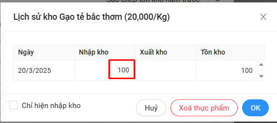 Lưu ý: Nếu thực phẩm đã được xuất kho thì khi xóa thực phẩm các thông tin xuất kho của thực phẩm này sẽ trở thành đi chợ (có ảnh hưởng đến STTA đã lưu)