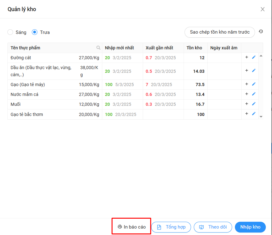 Bước 1: Tại giao diện Quản lý kho bấm vào nút In báo cáo
