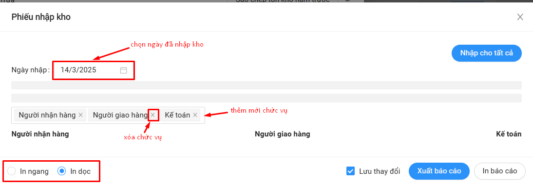 - Chọn chức vụ ký trong Phiếu nhập kho: