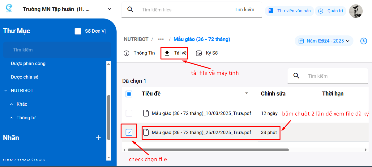 Bước 3: Bấm vào thư mục có tên NUTRIBOT để xem các báo cáo đã ký