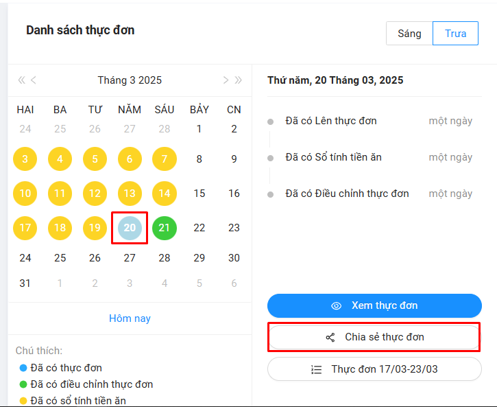 Bước 1: Chọn vào ngày đã có thực đơn -> Bấm Chia sẻ thực đơn
