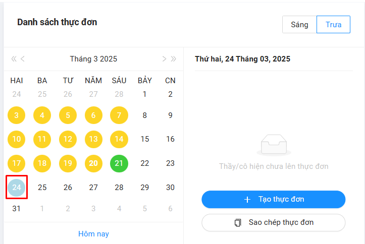 Bước 1: Tại Danh sách thực đơn -> chọn vào ngày chưa có thực đơn