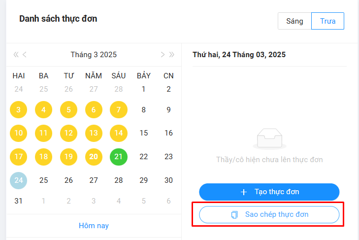 Sao chép thực đơn từ ngày này sang ngày khác, chia sẻ thực đơn