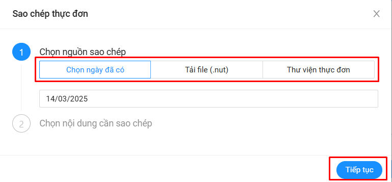 Bước 3: Chọn nguồn sao chép thực đơn và bấm nút Tiếp tục