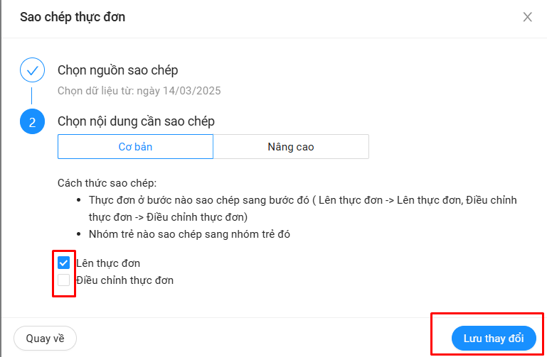 • Thực đơn chọn ở bước nào sẽ sao chép qua bước đó (VD: khi tick chọn Lên thực đơn thì phần mềm sẽ chép phần Lên thực đơn của dữ liệu gốc sang Lên thực đơn của ngày mới )