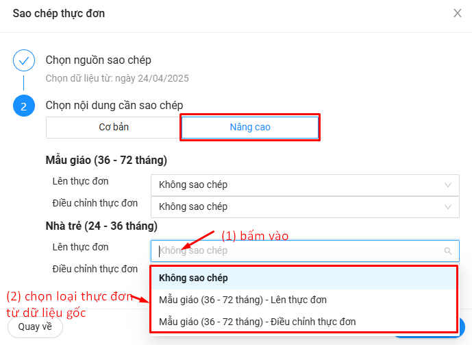 Thầy/Cô có thể sử dụng hình thức sao chép này để sao chép thực đơn từ nhóm trẻ này sang nhóm trẻ khác, từ bước này sang bước khác.