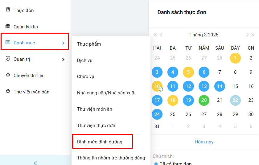 Tại Trang chủ bấm vào Danh mục -> chọn tab Định mức dinh dưỡng
