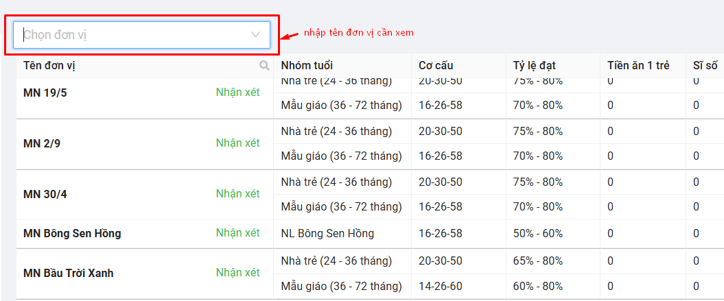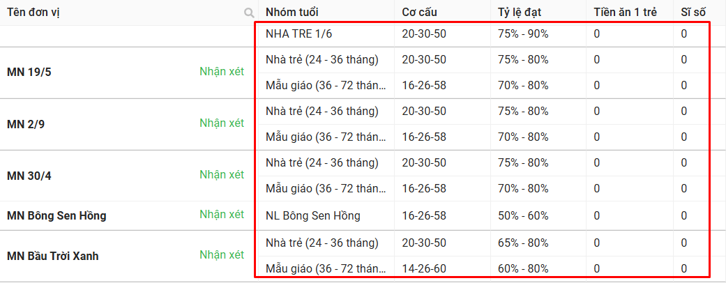 - Xem chi tiết dữ liệu thực đơn, sổ tính tiền ăn,…của các trường từ đó đưa ra những nhận xét dành cho trường