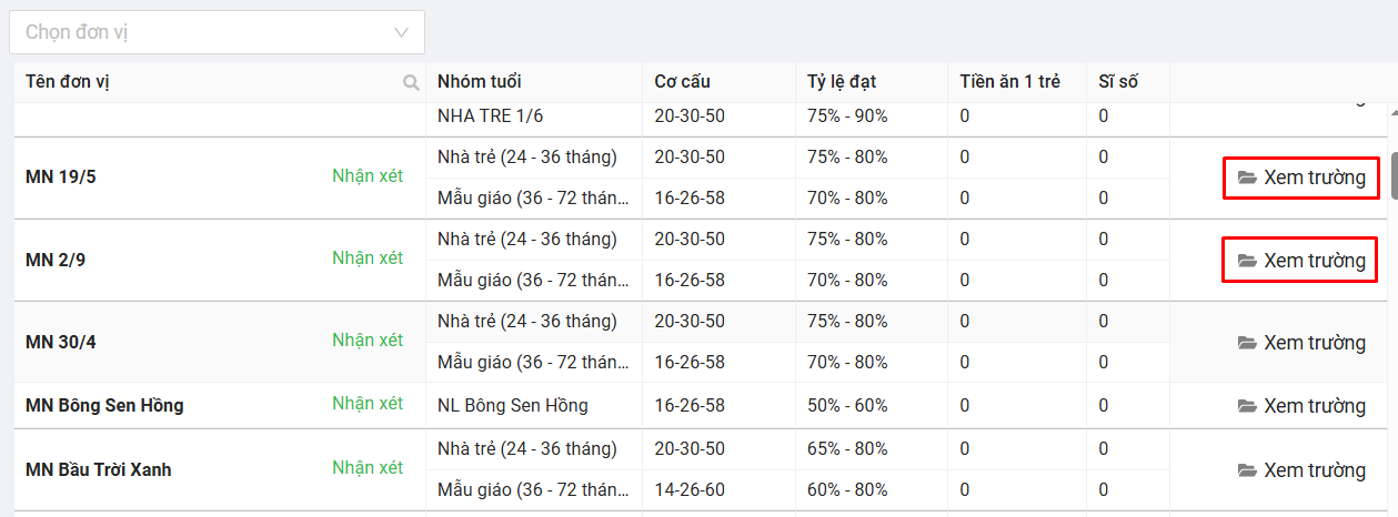 - Đồng thời có thể xem các trường đang áp dụng theo cơ cấu dinh dưỡng, tỷ lệ đạt nào để có cái nhìn tổng quan trước khi vào xem chi tiết từng trường