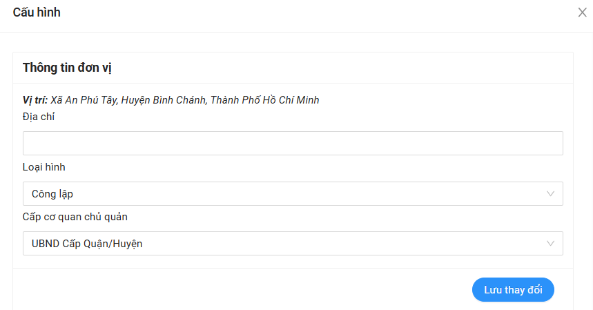 Thầy/cô cập nhật thông tin địa chỉ đơn vị, loại hình trường, cấp cơ quan chủ quản( các báo cáo sẽ hiển thị cấp cơ quan chủ quản thầy/cô chọn tại đây). Sau khi cập nhật bấm Lưu thay đổi để hoàn tất.