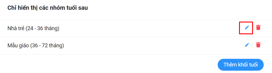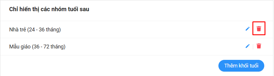 - Nếu muốn xóa nhóm tuổi không dùng, thầy/cô bấm vào biểu tượng thùng rác -> bấm