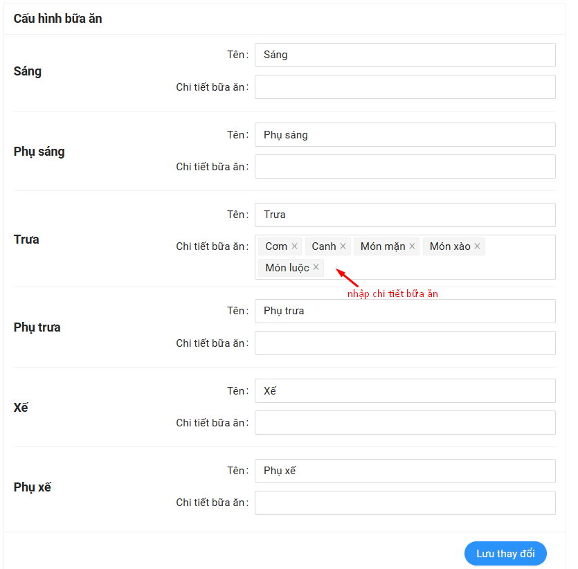 - Tại phần chi tiết bữa ăn thầy/cô có thể chia ra chi tiết. VD: Bữa Trưa có thể thêm chi tiết thành Cơm, Canh, Món mặn, Món xào, Món luộc.