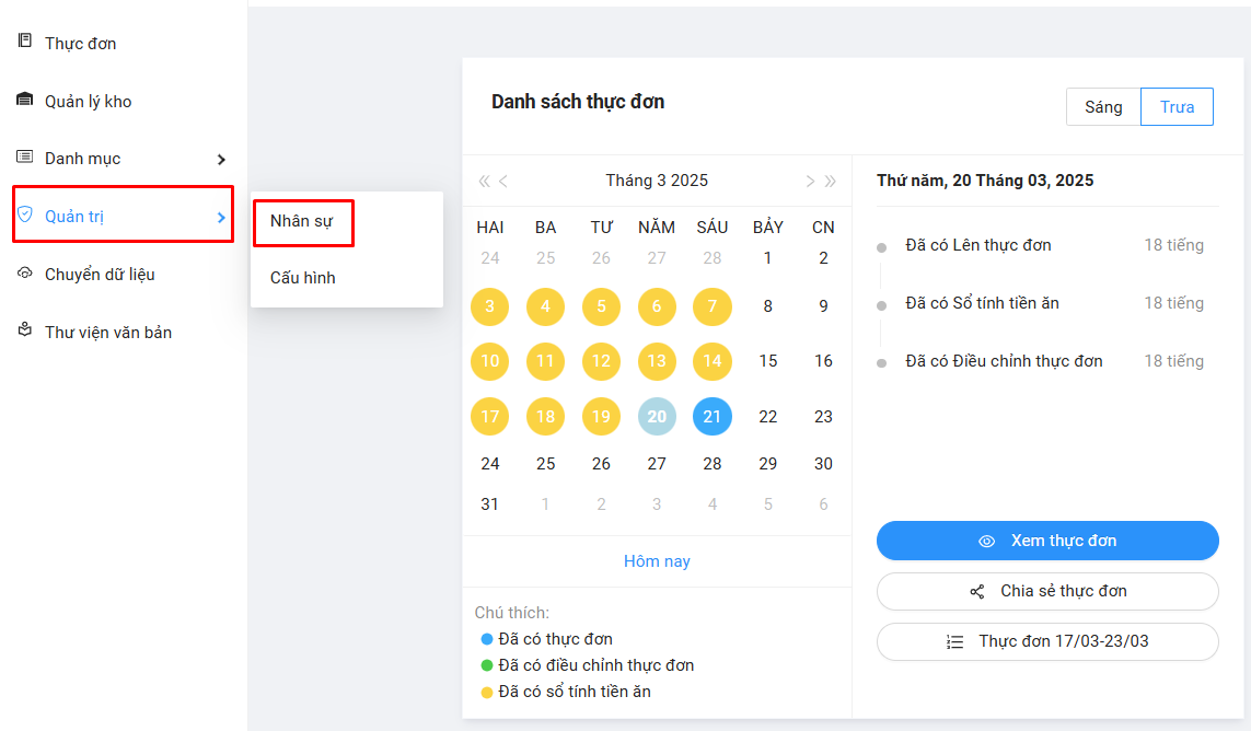Tài khoản Quản trị: Có toàn quyền trên phần mềm bao gồm các chức năng thực hiện sổ sách bán trú, quản trị nhân sự và cấu hình thông tin trên phần mềm.