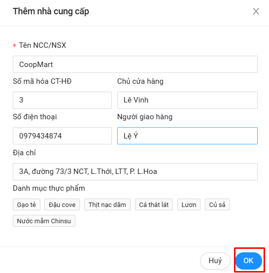 - Thêm thông tin Nhà cung cấp / Nhà Sản Xuất để theo dõi nguồn nhập thực phẩm