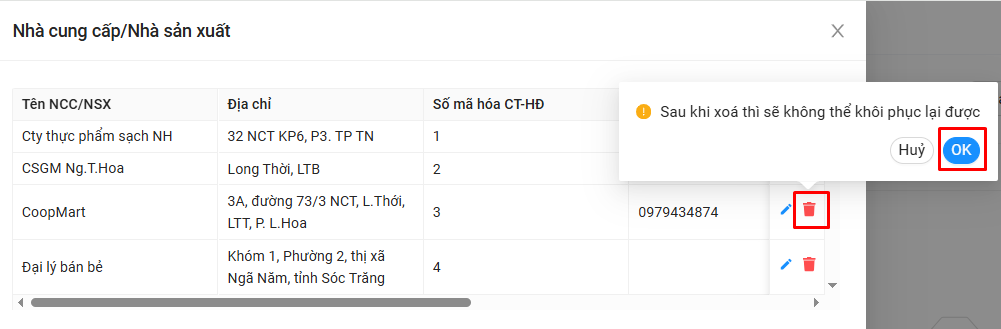 Bước 1: Bấm vào biểu tượng thùng rác tại NCC/NSX muốn xóa