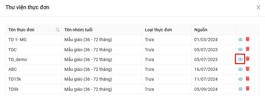 - Để xem thực đơn mẫu đã lưu, thầy/cô bấm vào biểu tượng mắt
