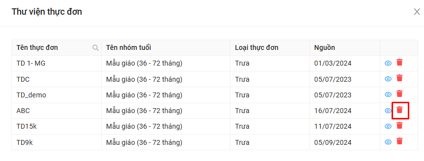 - Để xóa thực đơn mẫu trong thư viện, thầy/cô bấm vào biểu tượng thùng rác